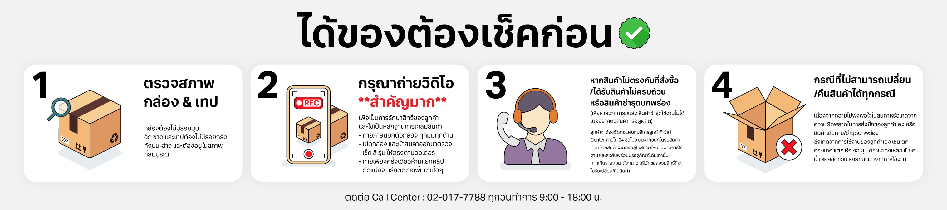 เมื่อได้รับพัสดุ โปรดถ่ายวิดีโอคลิปการเปิดกล่อง และการตรวจสอบสินค้า เพื่อใช้เป็นหลักฐานในการขอเคลม หรือคืนสินค้ากรณีสินค้าชำรุด เสียหาย ผิดรุ่น หรือได้สินค้าไม่ครบ หากไม่มีหลักฐานงดรับเคลมทุกกรณี
